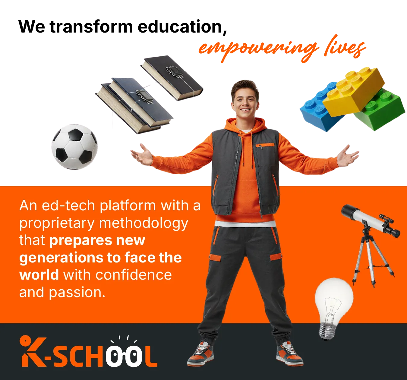 Respuesta Ed-tech a las necesidades de las nuevas generaciones. Con metodología propia, K-Learning, hecha para enfrentar los retos del mundo, vivir sin miedos, y les permite a los jóvenes ser felices con lo que les apasiona.